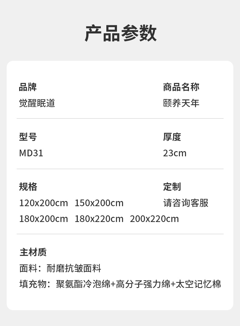 MD31颐养天年 厚度:23cm 睡感:偏硬 自适应 指导价:7539.00元