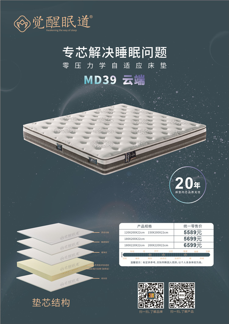 MD39 22cm 云端 两用型(5589/5699/6599)采用涤纶印花银丝针织面料,观感时尚,耐磨抗皱,入眼入心有睡欲。内部垫芯一次成型、自适应、强通透加工技术,恒温减压快速入眠。适中与微…